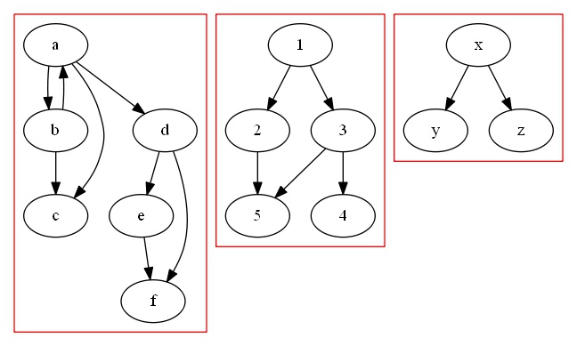let sparse = ["a -> b, c, d"; "b -> a, c"; "d -> e, f"; "e -> f"; "1 -> 2, 3"; "3 -> 4, 5"; "x -> y, z"; "2 -> 5"] let grs = StrGraph.FromStrings sparse grs.Visualize(clusters = true)
