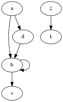 createGraph "digraph{a->b; b->c; 2->1; d->b; b->b; a->d}" "dot.exe" None